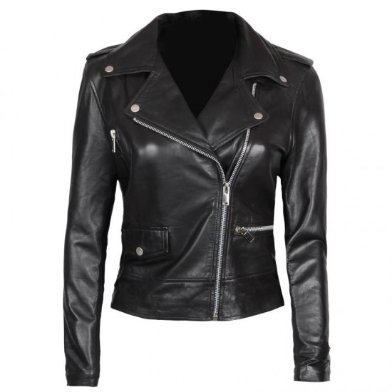 Take your regular style a step forward with this chic slim cut ladies jacket made of real supple leather for mobility and style. It features a contrasting asymmetrical zip closure, metal studs, zipper pocket, flaps and more. Top it over jeans for a casual or a dress for an elegant look.