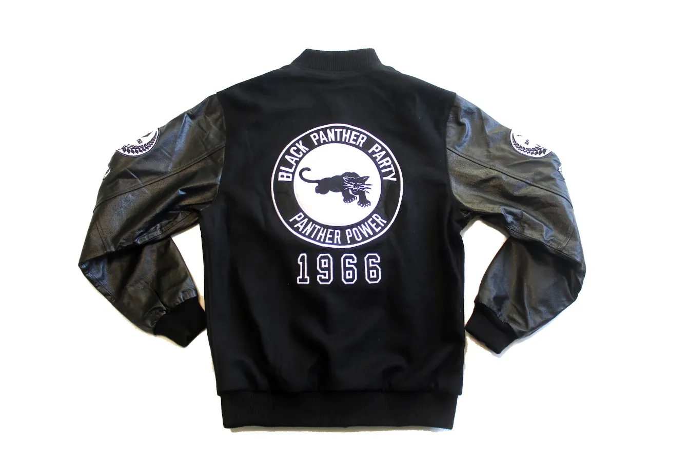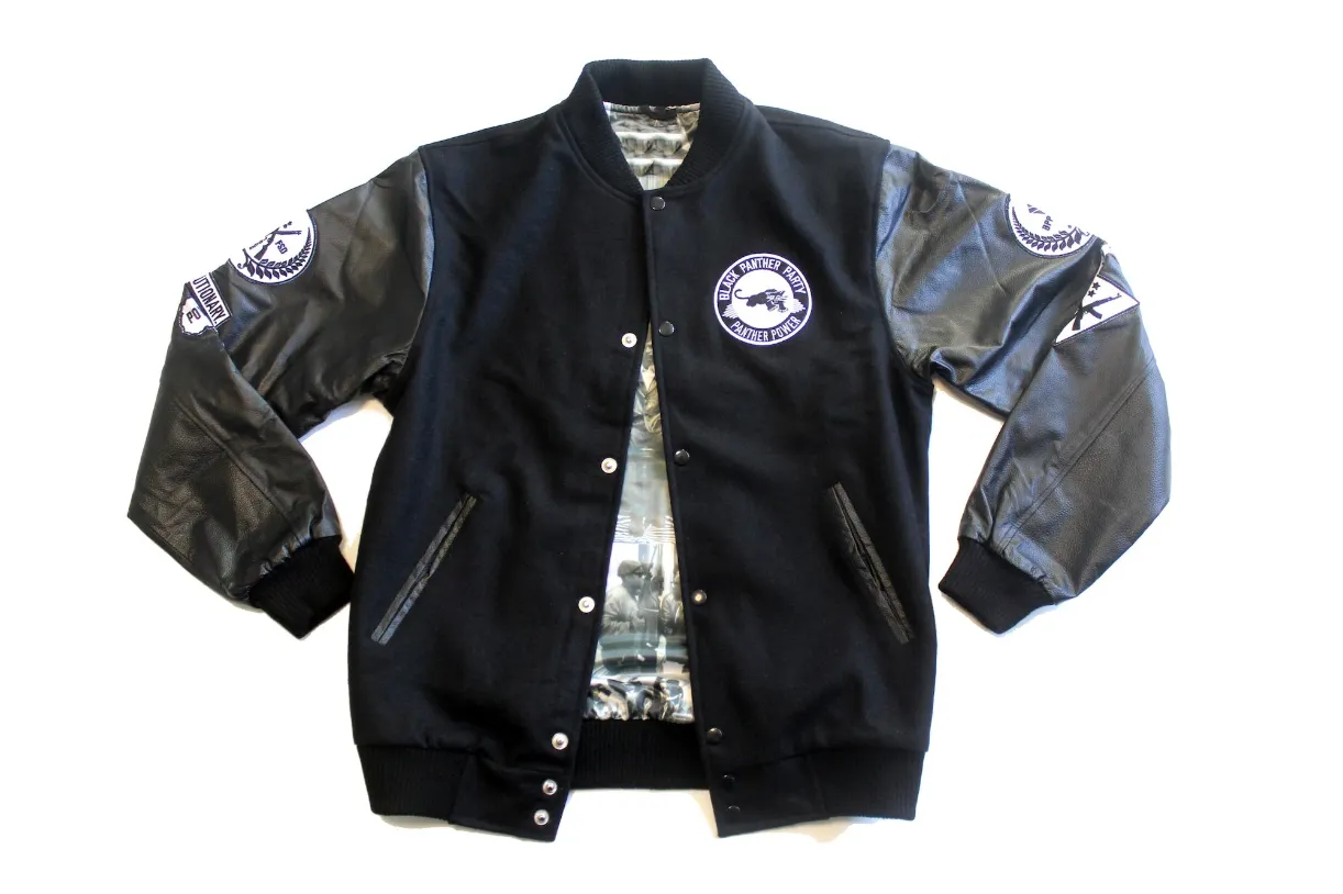 The Black Panther Wool and Leather Bomber Jacket is made of wool and faux leather and features nine Black Panther-inspired patches. 1966 is highlighted on the back, the year Black Panther Party for Self-Defense was founded.
