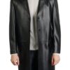 This long coat is the new edition fashion apparel exclusively designed for you. It is created from the finest quality real leather with a glossy texture. Characteristics include button closure, long sleeves, lapel, pockets, and black color.