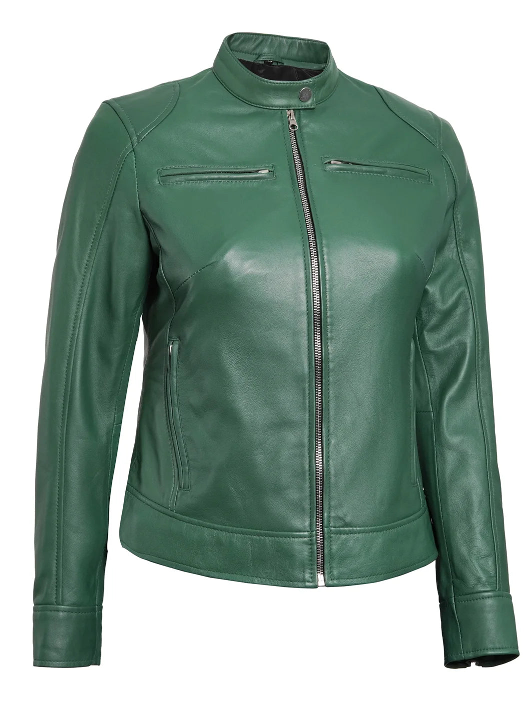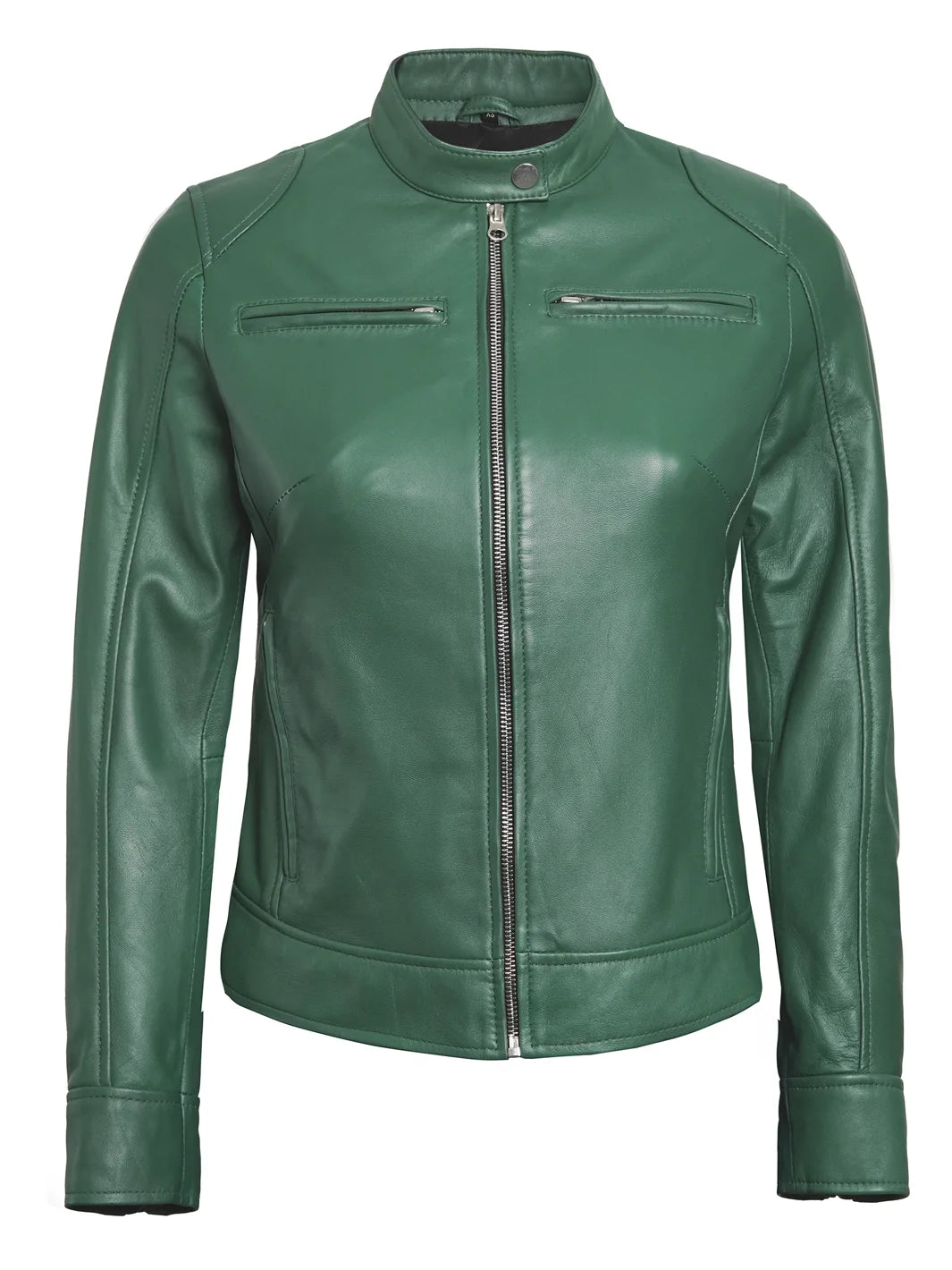 Redefine your outerwear with this Green Leather Biker Style Jacket, tailored for a modern fit with classic biker elements. Featuring a snap-tab collar, zip closure, and five practical pockets, it merges sleek aesthetics with everyday functionality. Crafted in soft lambskin, it’s an ideal pick for rides or off-duty style.