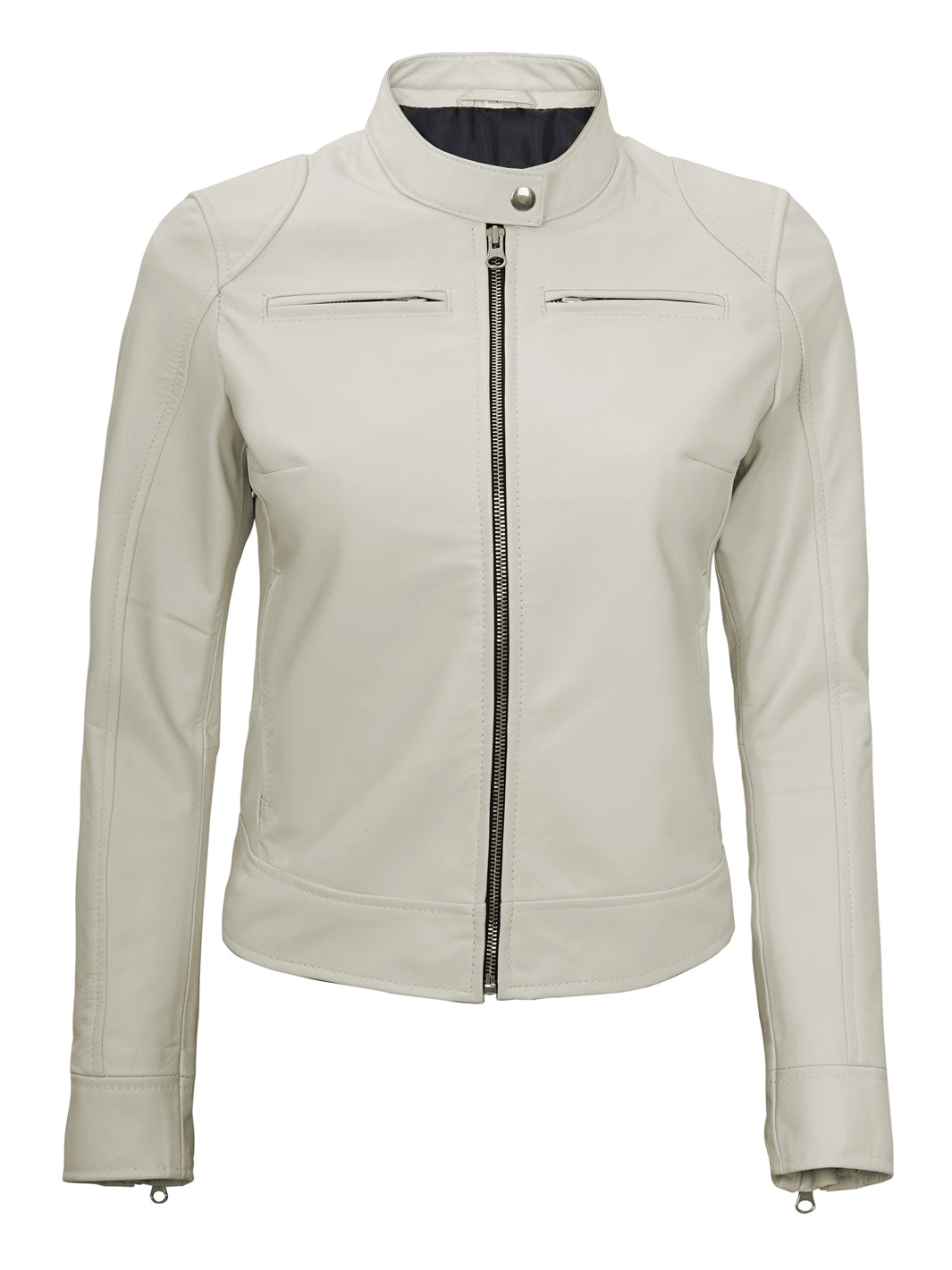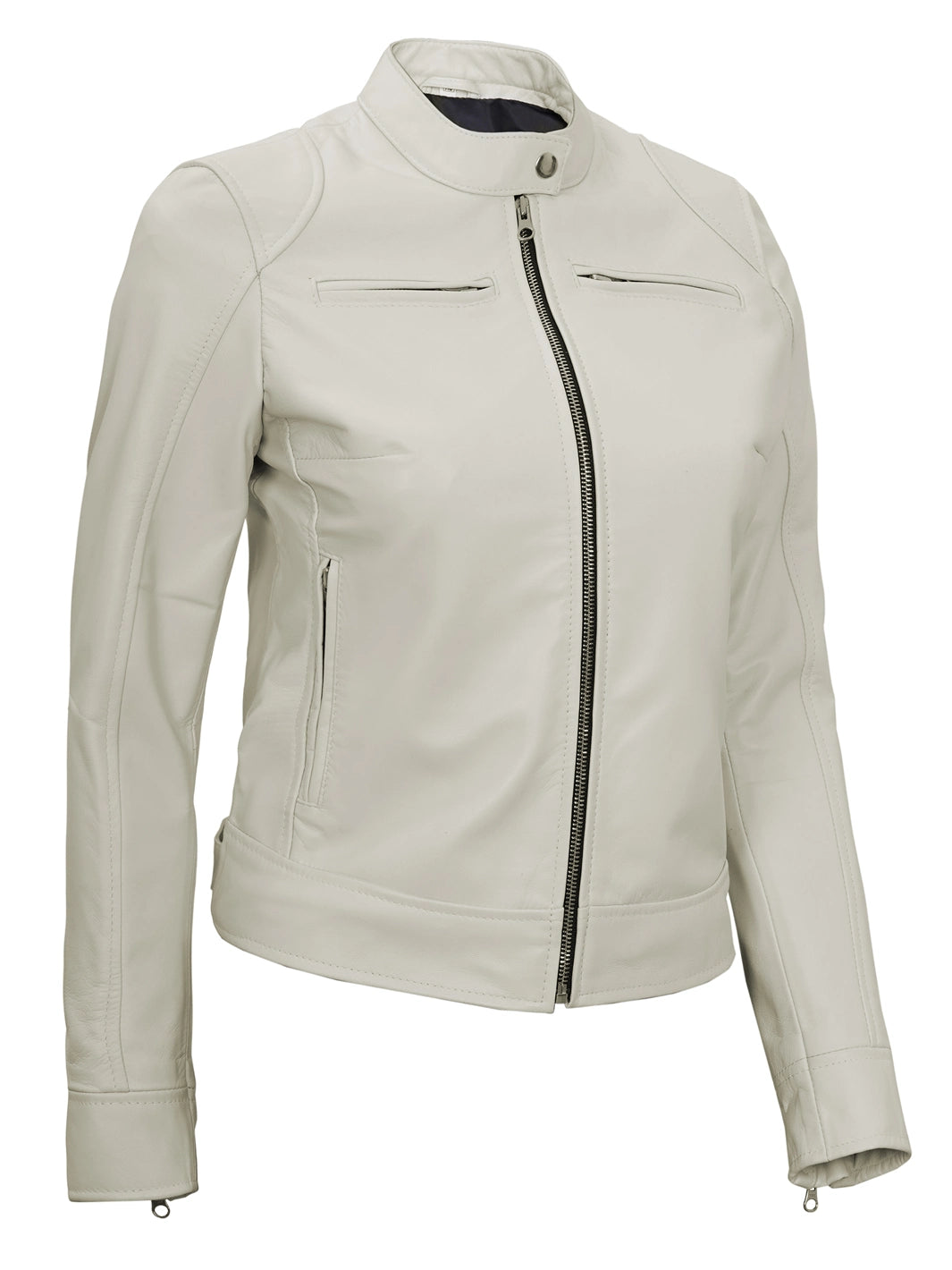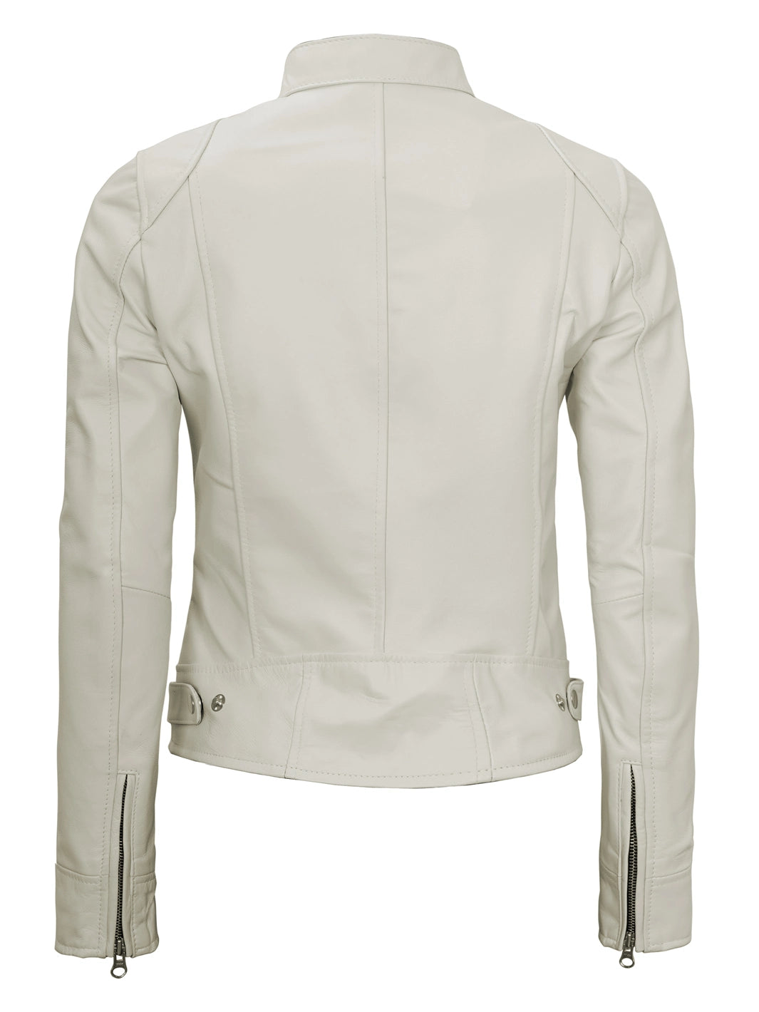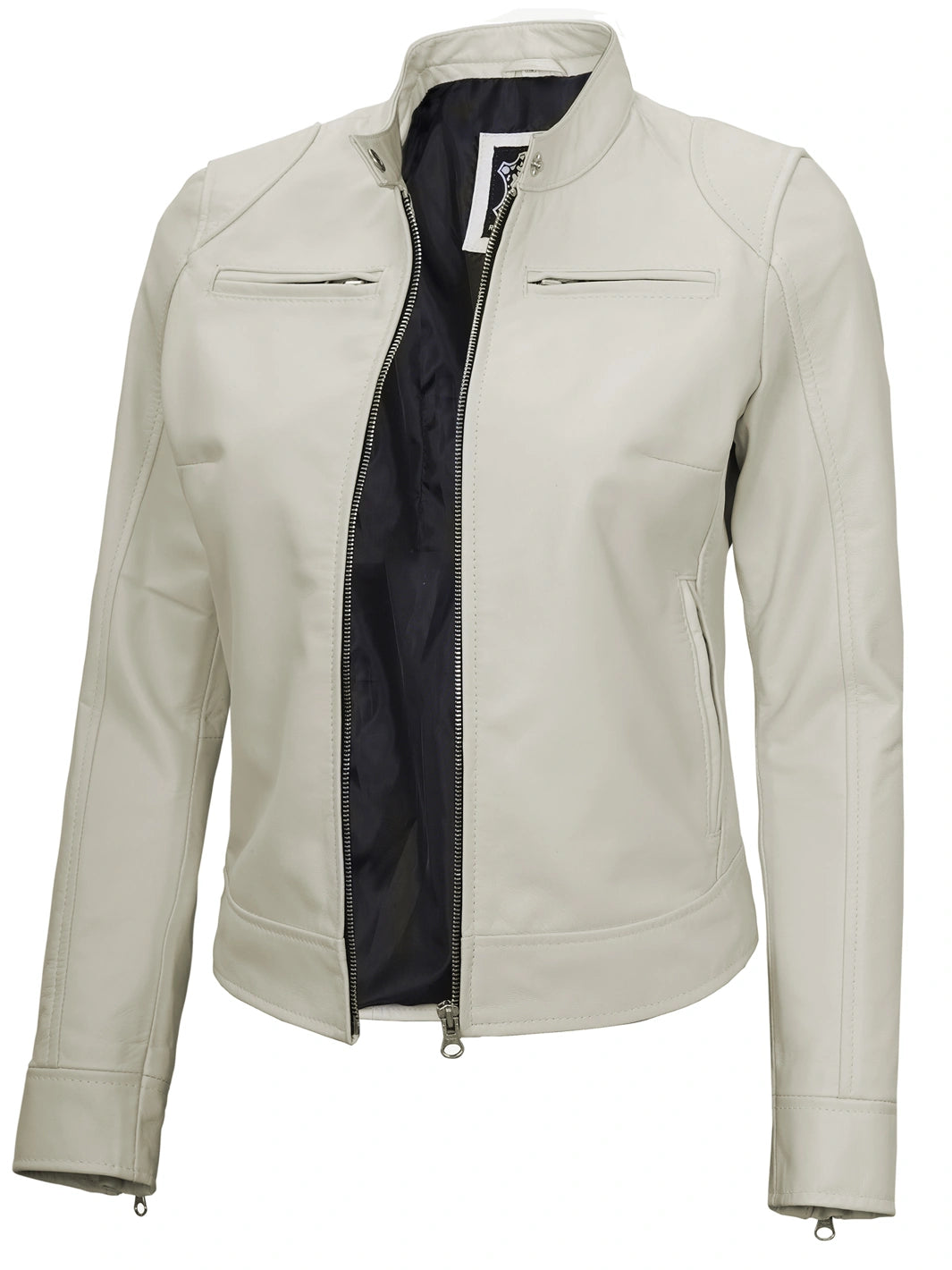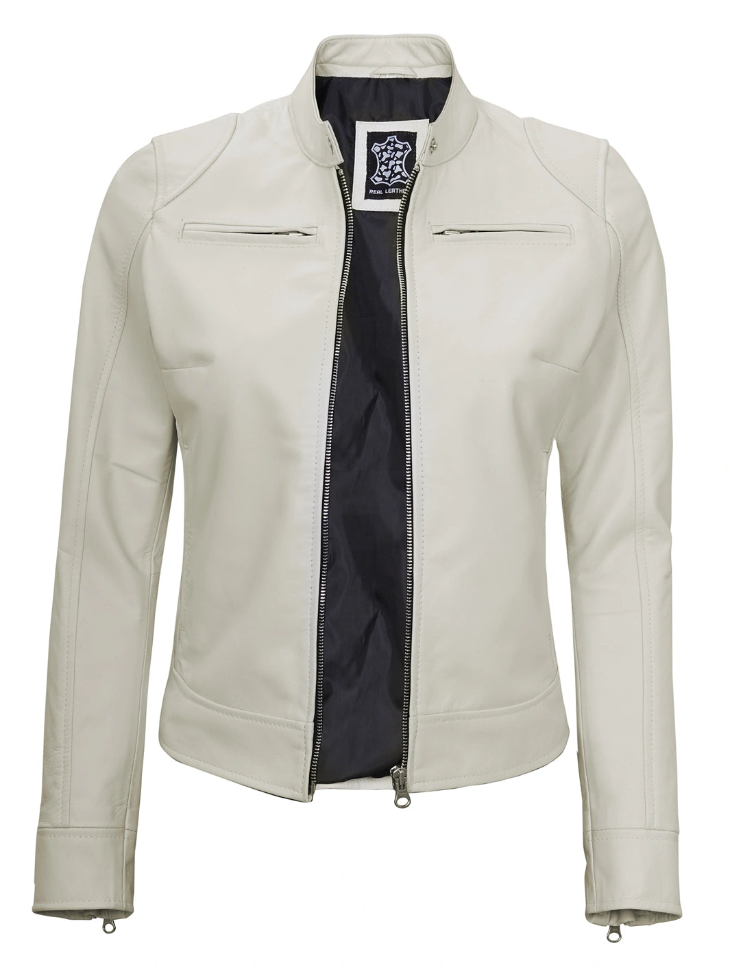 Ride in style with this Off White Cafe Racer Jacket, made from real lambskin leather and tailored for a sleek fit. Featuring a snap-tab collar, zip closure, and five functional pockets, it offers a blend of bold design and everyday comfort. A standout addition to your moto-inspired wardrobe.