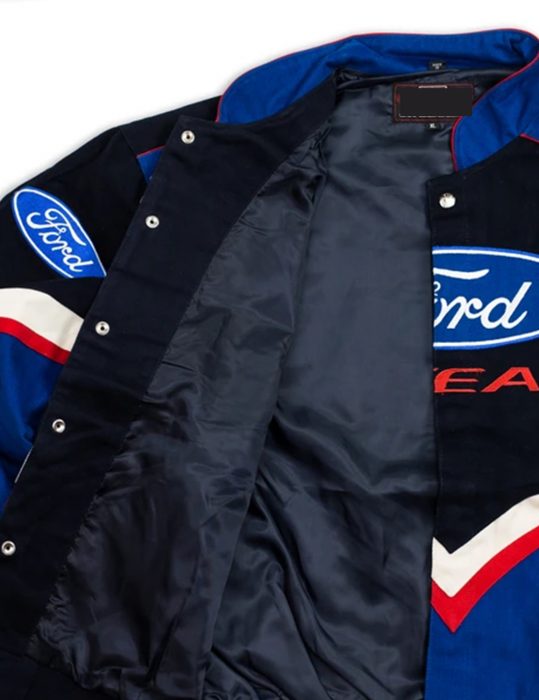 Blue Vintage Ford Racing Jacket is going to give you extreme impact protection because of its sturdy and durable outer layer of genuine wool-blend internally combined with viscose. Full-length sleeves are secured with rib-knitted cuffs. Snap-tab front closure makes it more comfortable and cozier. Bristling style collars are an indispensable part of this jacket. Blue and black this jacket is hugely popular in the racer community. During your ride, two side waist pockets can hold your belongings.