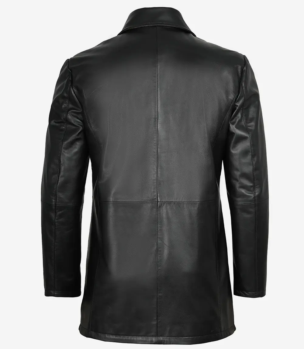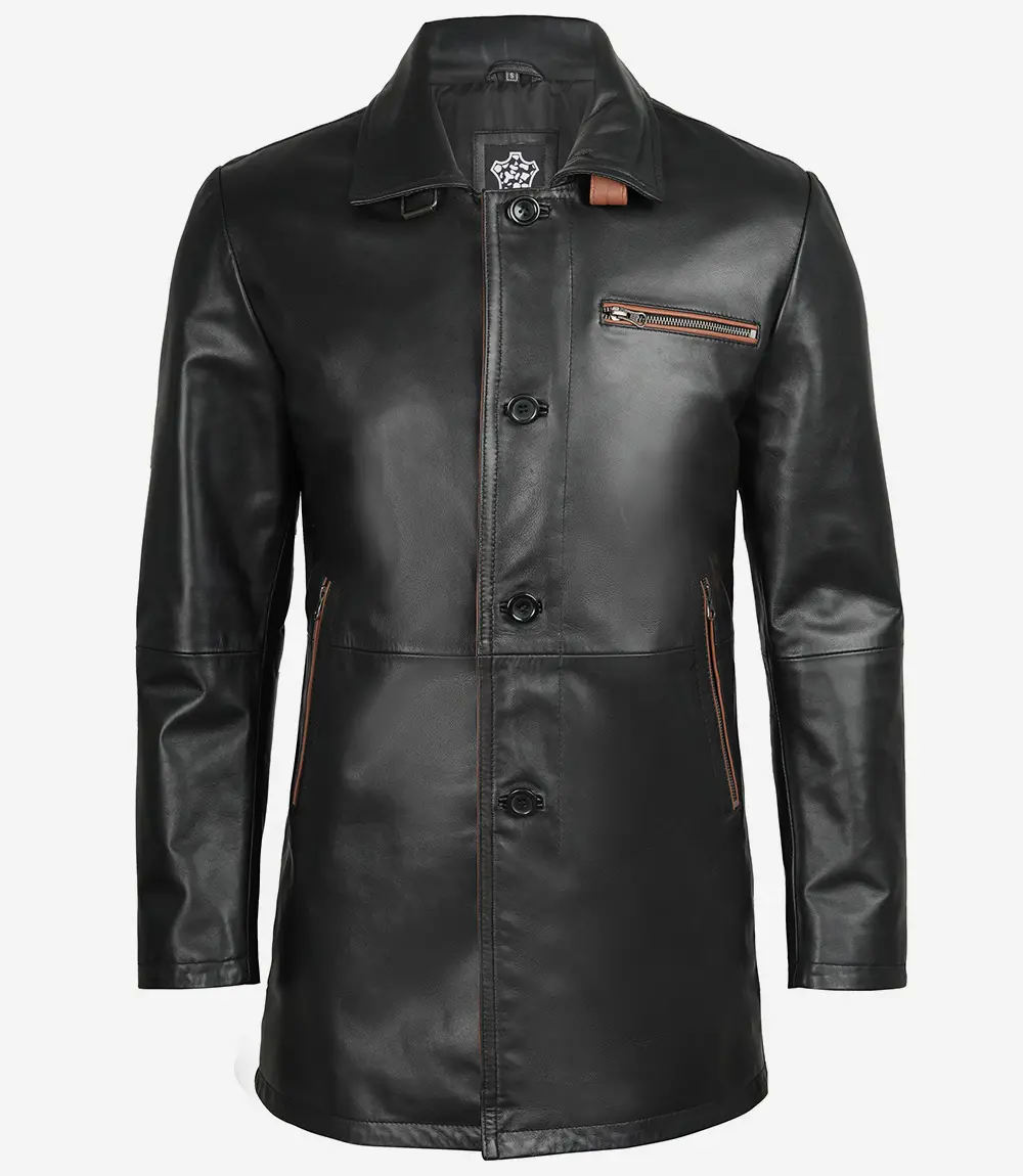 This men’s black leather car coat combines modern style with everyday comfort. Designed with an adjustable belted collar, three functional zipper pockets, and a smooth polyester lining, it’s a sleek outerwear choice for both casual and smart looks.