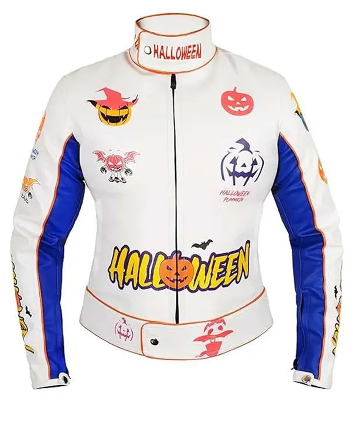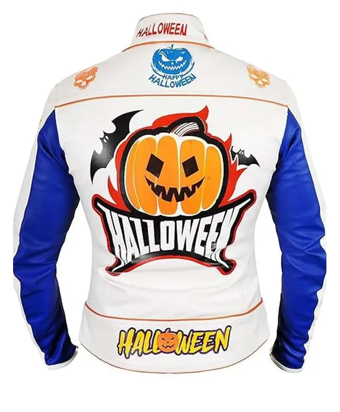 Halloween always reveals the playful and excited side of everybody’s character, the spooky lights, pumpkins and Halloween-themed decorations of the streets. This Halloween Pumpkin Printed White Leather Jacket takes that Halloween kind of spirit and is something you can wear on Halloween and after that throughout the season. The white-and-blue base gives it a neat, fresh feel, while the pumpkin print brings in enough attraction to turn heads.