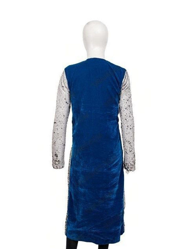 The Birds Of Prey Duster Coat is made up of velvet and it has sequins everywhere. It has viscose material on the inside. It has a round neck collar. The sleeves are long. The front is open style. It has a blue back and front brown with sequins.