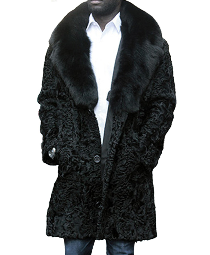 Jeffery Real Astrakhan Persian Lamb Karakul Black Warm Coat With Fox Fur Collar