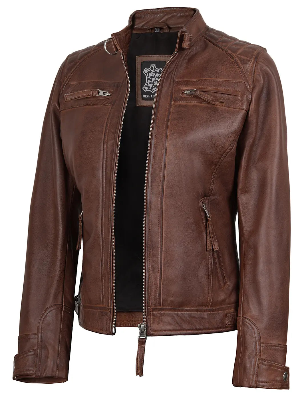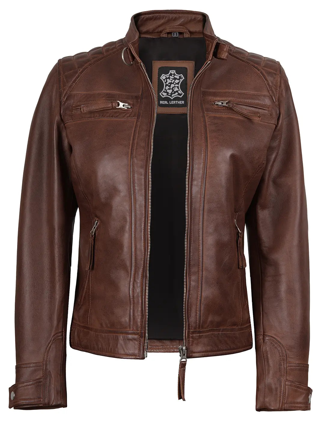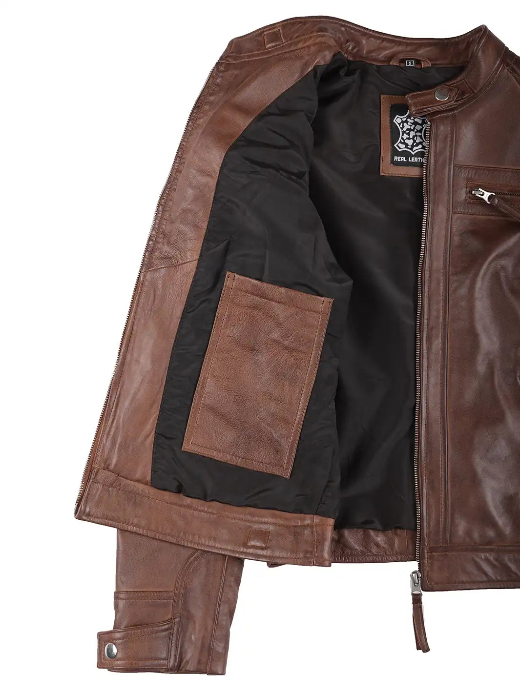 Refine your look with the Cognac Brown Cafe Racer Jacket, featuring detailed shoulder quilting and a smooth zip front. Made from real lambskin with a rich cognac finish, it includes adjustable side buckles, snap cuffs, and ample pocket space. A sleek biker-inspired staple with comfort and edge.