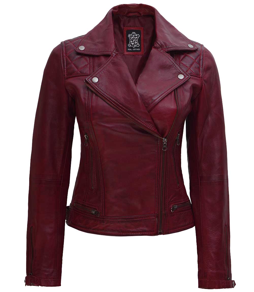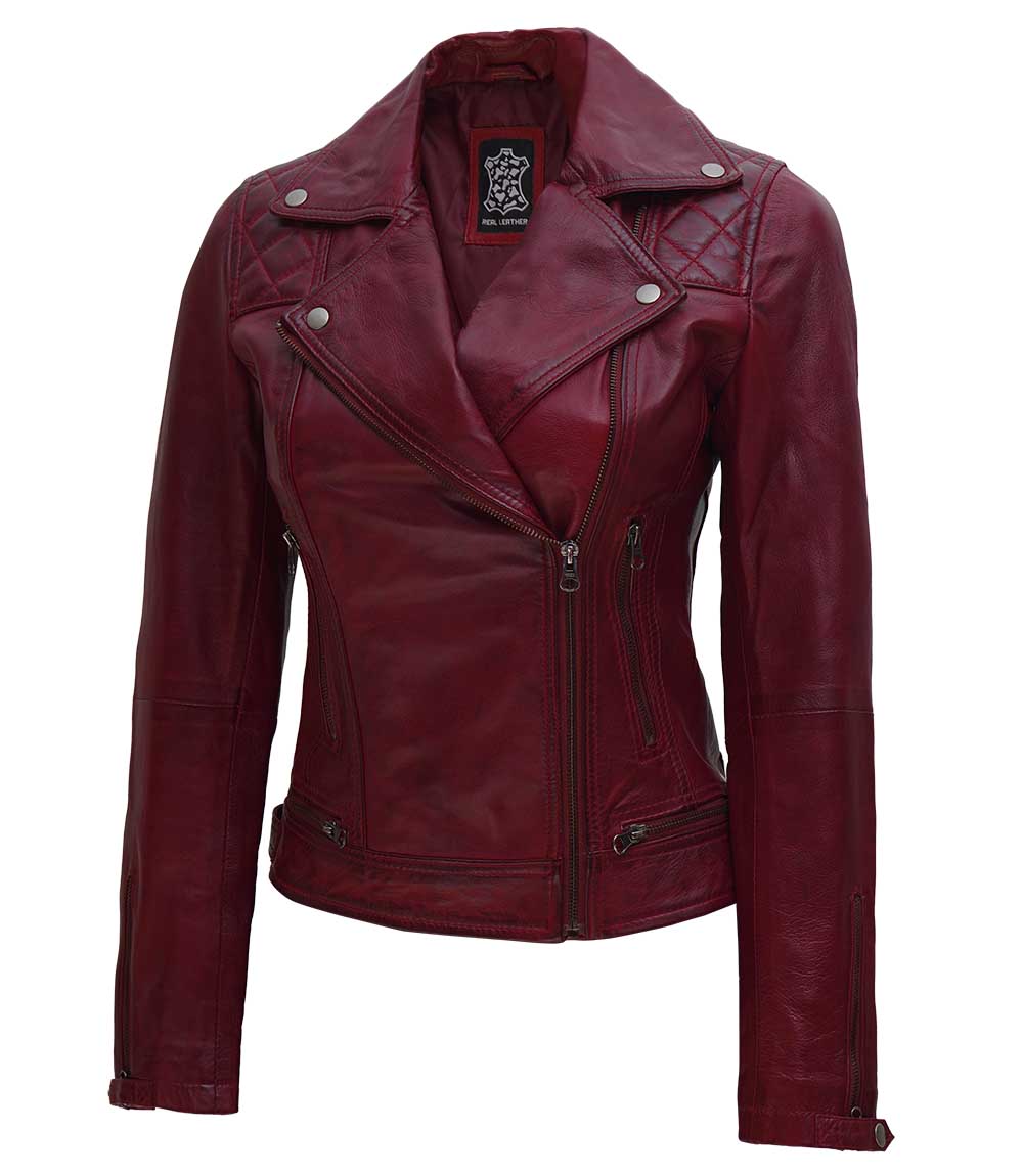 Kimberley Womens Quilted Leather Motorcycle Maroon Jacket