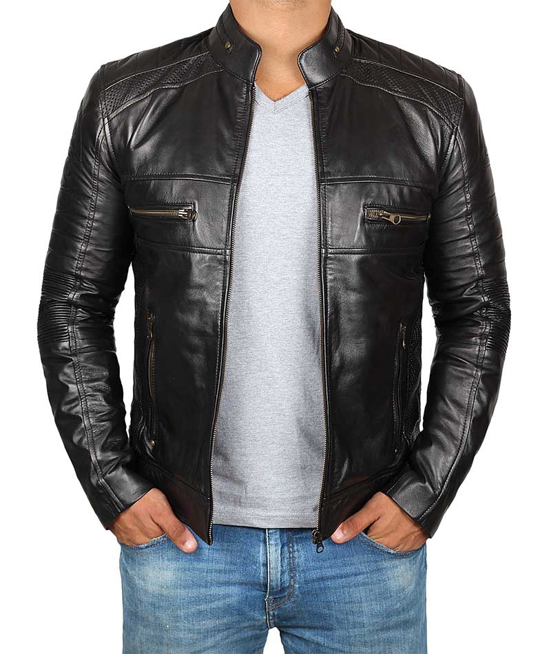 Mens Black Cafe Racer Biker Leather Jacket