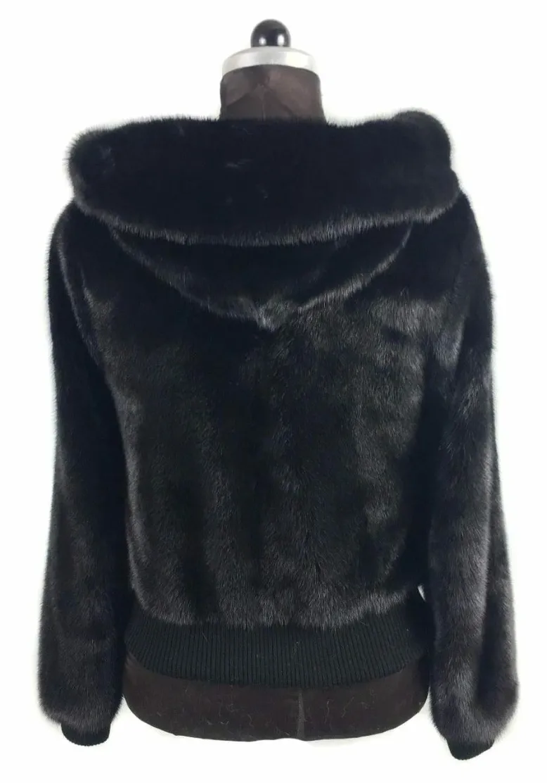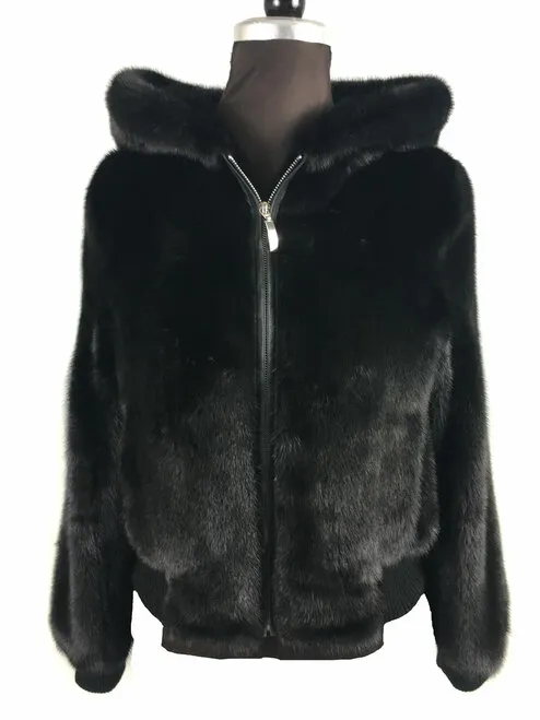 Mens Black Mink Fur Hooded Bomber Jacket