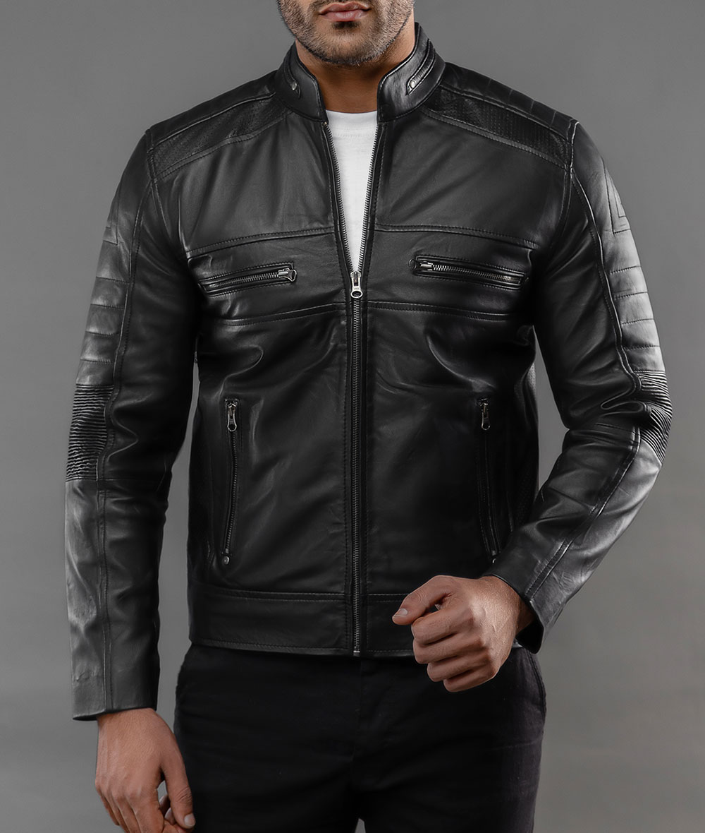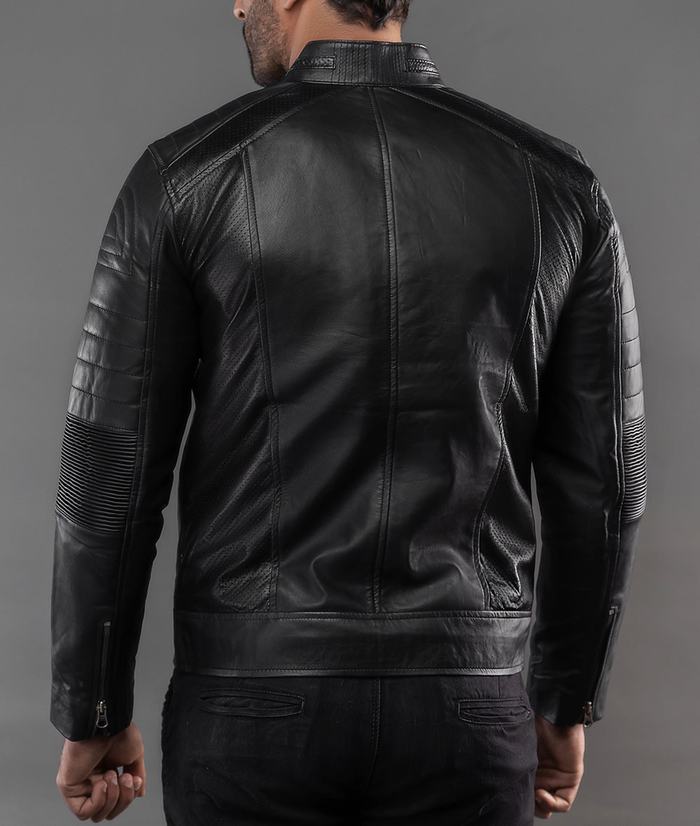 Mens Black Perforated Lambskin Cafe Racer Leather Jacket