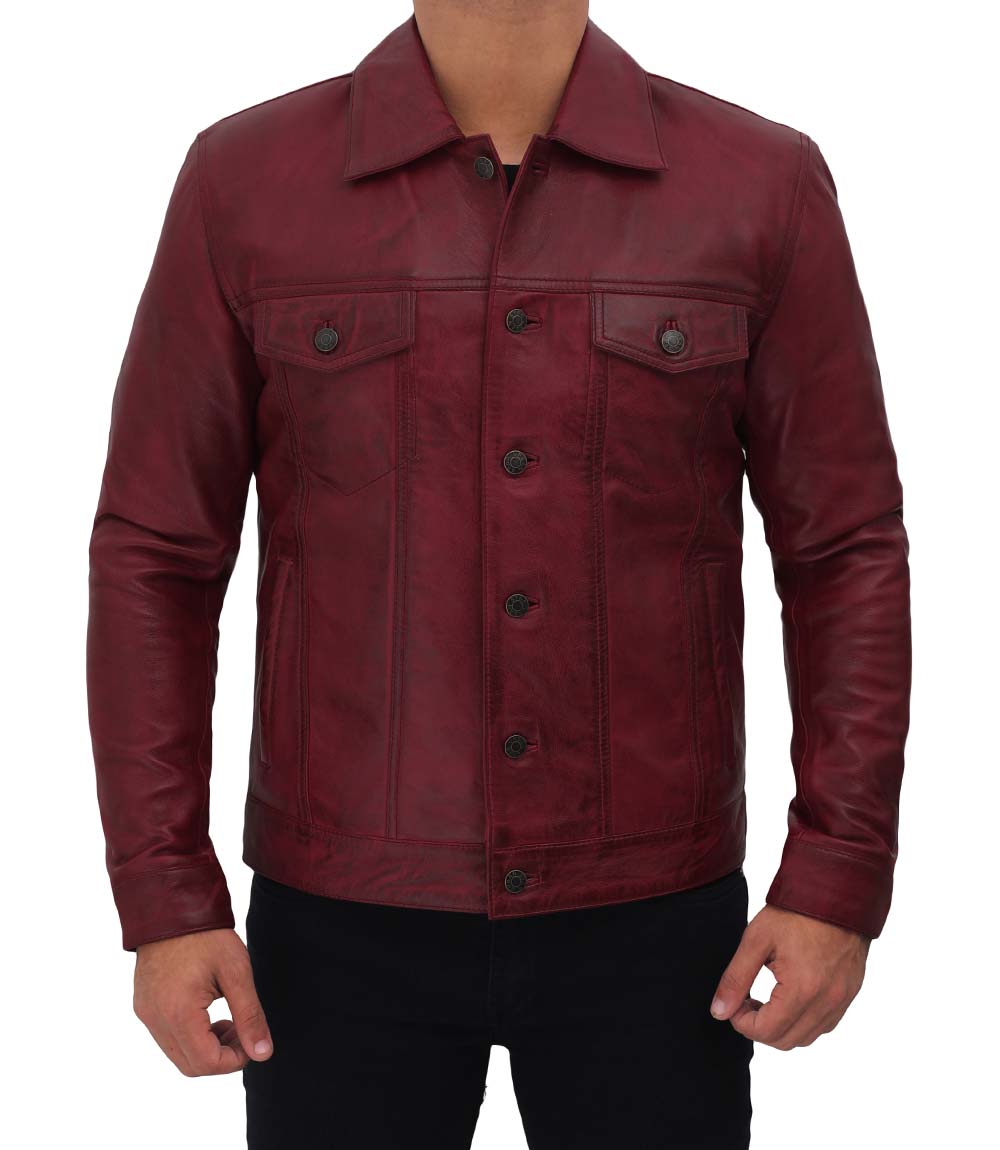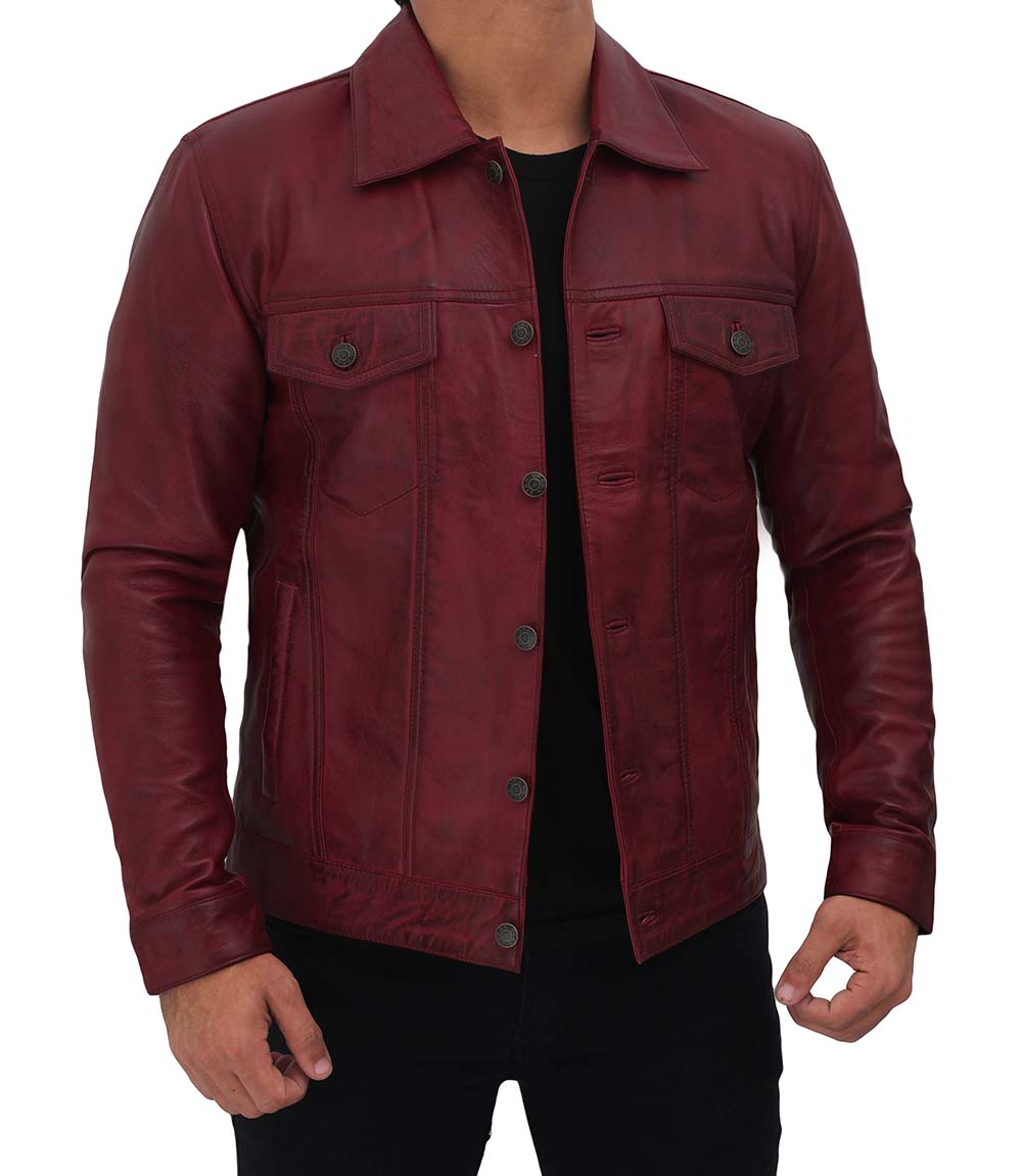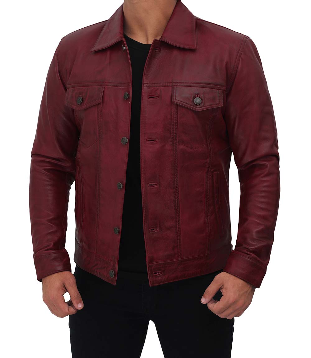 Mens Maroon Leather Trucker Jacket