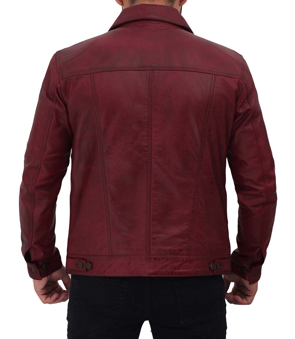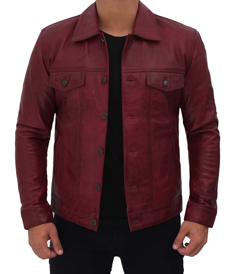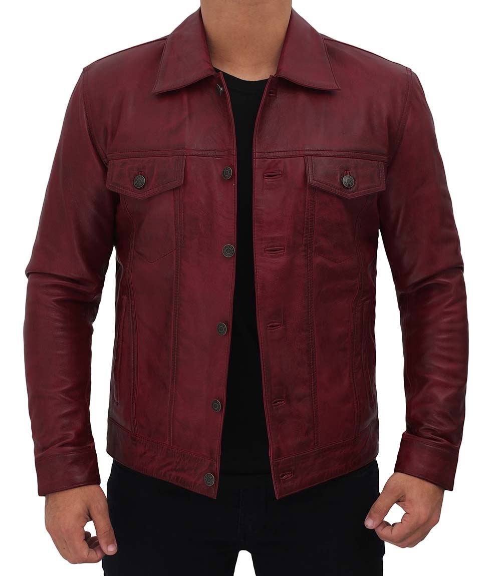 Mens Maroon Leather Trucker Jacket