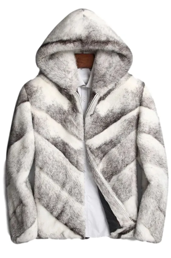 Mens White and Grey Cross Hooded Mink Fur Coat