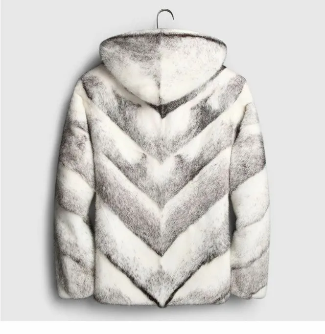 Mens White and Grey Cross Hooded Mink Fur Warm Coat For Winter Season