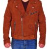 This AMIRI motorcycle jacket is available in the suede leather material. Its orange-brown sharp color is exceptionally catchy and irresistible. It has a trench-style collar with frontal zipper closure and bottom belt. The sleeves are full with zipper cuffs and two waist pockets add style to its design.