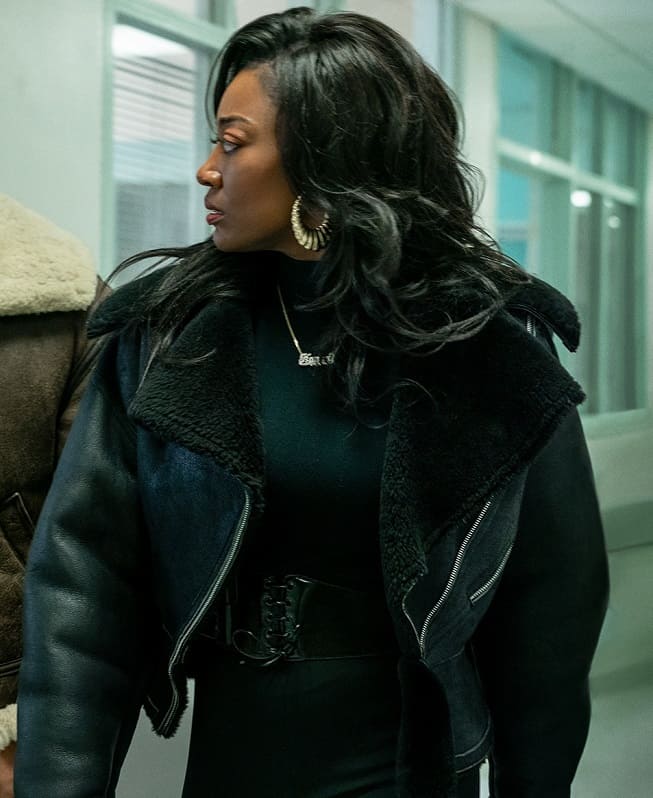 Patina Miller wears Power Book III Raquel Thomas Fur Jacket made of faux fur material. You can wear it at public gatherings and outdoors.