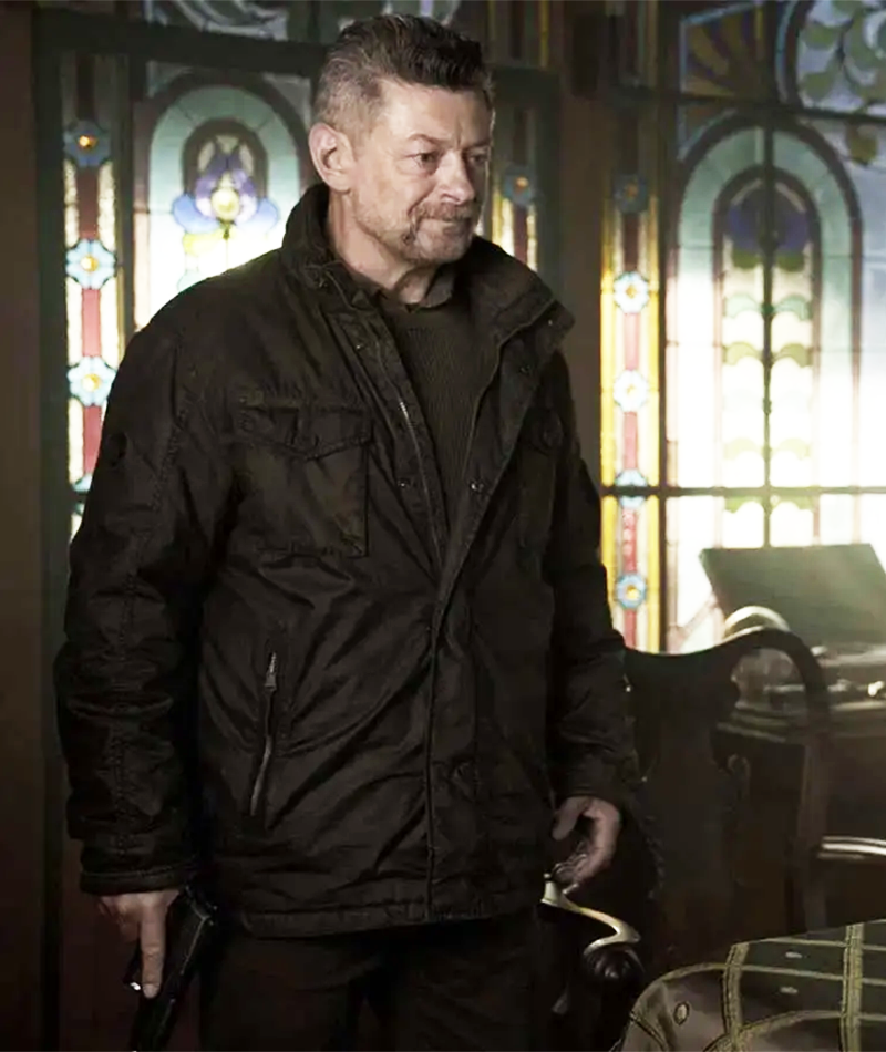 SAS Red Notice is a British Action Thriller movie directed by Magnus Martens. The film stars multiple major superstars, with its story revolving around a group of well-trained criminals & a SAS Operator who has been captivated along with his girlfriend in a train, Where Andy Serkis plays the role of a SAS Commander (George Clements) has been seen wearing a lot of charming costumes from which the Black Jacket is one of them.