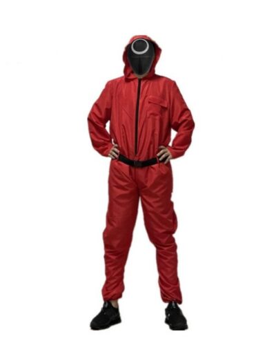 This Squid Game Guard jumpsuit is manufactured using the supreme quality of cotton with a soft viscose lining as an interior to keep you all comfy and cozy. It is pink in color with an attached hood to keep your identity hidden giving a more terrifying look. It features a front zippered closure with two side pockets and one front pocket. Its sleeves are full in length with rib-knitted cuffs. So, grab this jumpsuit asap and boo away your friends!