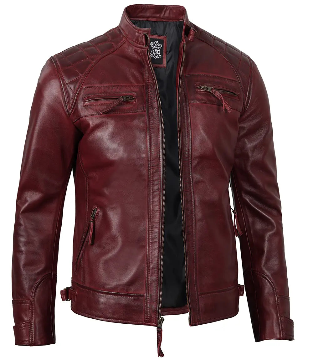 Tall Men’s Burgundy Biker Leather Jacket for heights 6’0″ to 6’4″. Made from 100% real lambskin leather with a soft polyester lining, it features a bold burgundy finish, strap buckle collar, YKK zip closure, and four exterior zipped pockets. Includes two interior pockets—one for secure mobile storage—offering both style and function in a classic biker design.