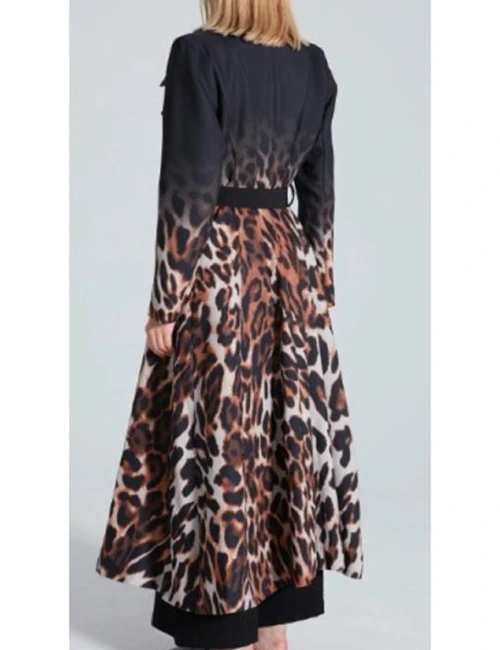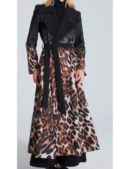 Now let’s talk about the details. The coat is built with a wool blend fabric, so it’s warm but never bulky. Inside, it’s lined with soft viscose, which keeps it smooth and breathable. It features two side pockets and one inner pocket for practicality (because a power coat should still carry your phone and lipstick, right?). The wide lapel collar frames the face beautifully, the open hem cuffs add a touch of flow, and the belted closure lets you adjust the fit. But the real star is the ombre brown leopard print, a daring design that takes classic animal print and makes it even more dynamic.