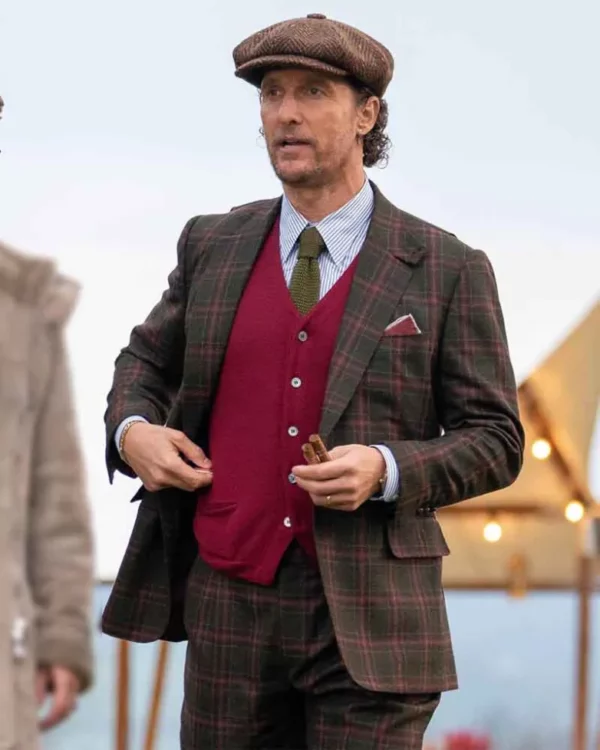 The Gentlemen Matthew McConaughey Brown PartyWear Plaid Suit is a stylish and sophisticated choice for any formal occasion. The brown plaid pattern adds a touch of elegance, while the impeccable tailoring ensures a perfect fit. Plaid suits are a popular option for individuals who want to seem up-to-date. They’re a fantastic option for folks who are sick of wearing solid-colored suits because they include simple, contemporary designs and a variety of hues. You can pair this plaid suit with a maroon vest to enhance the look, but first here you go with a detailed overview of this brown plaid suit.