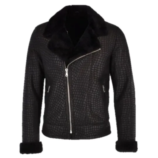 Torres Black Snake Pattern Biker Aviator Fur Collar Shearling Leather Jacket