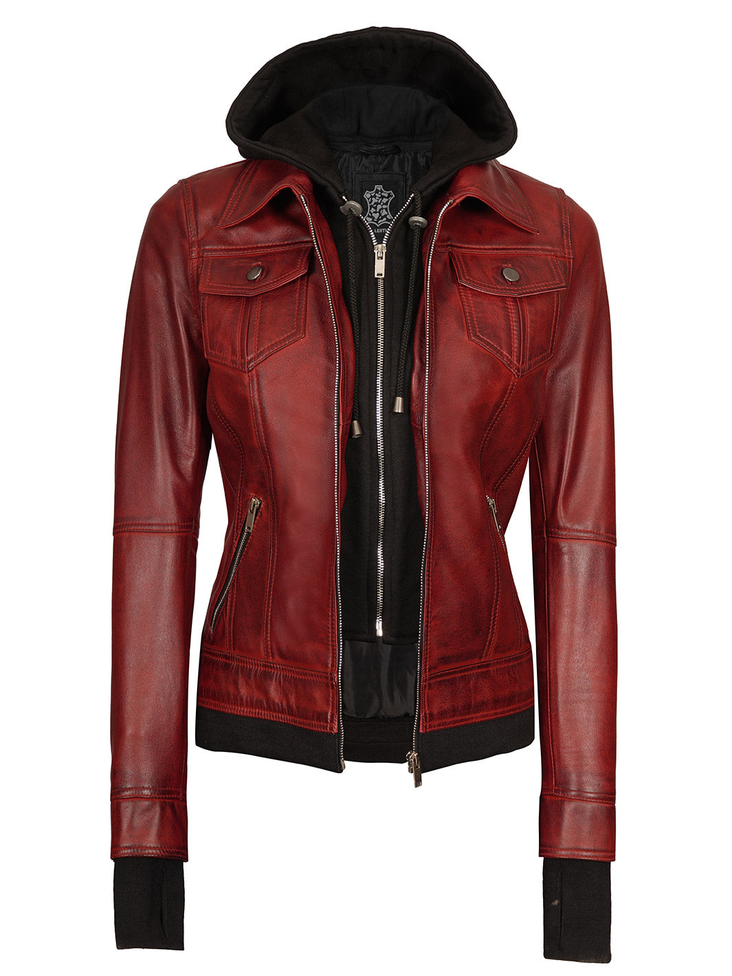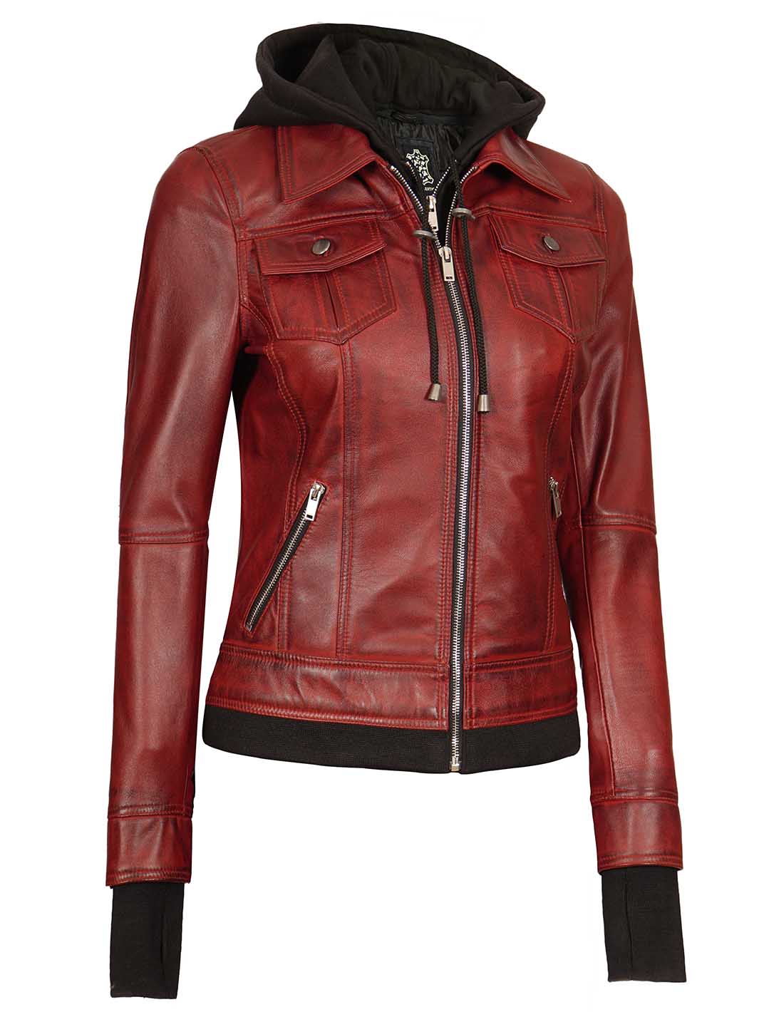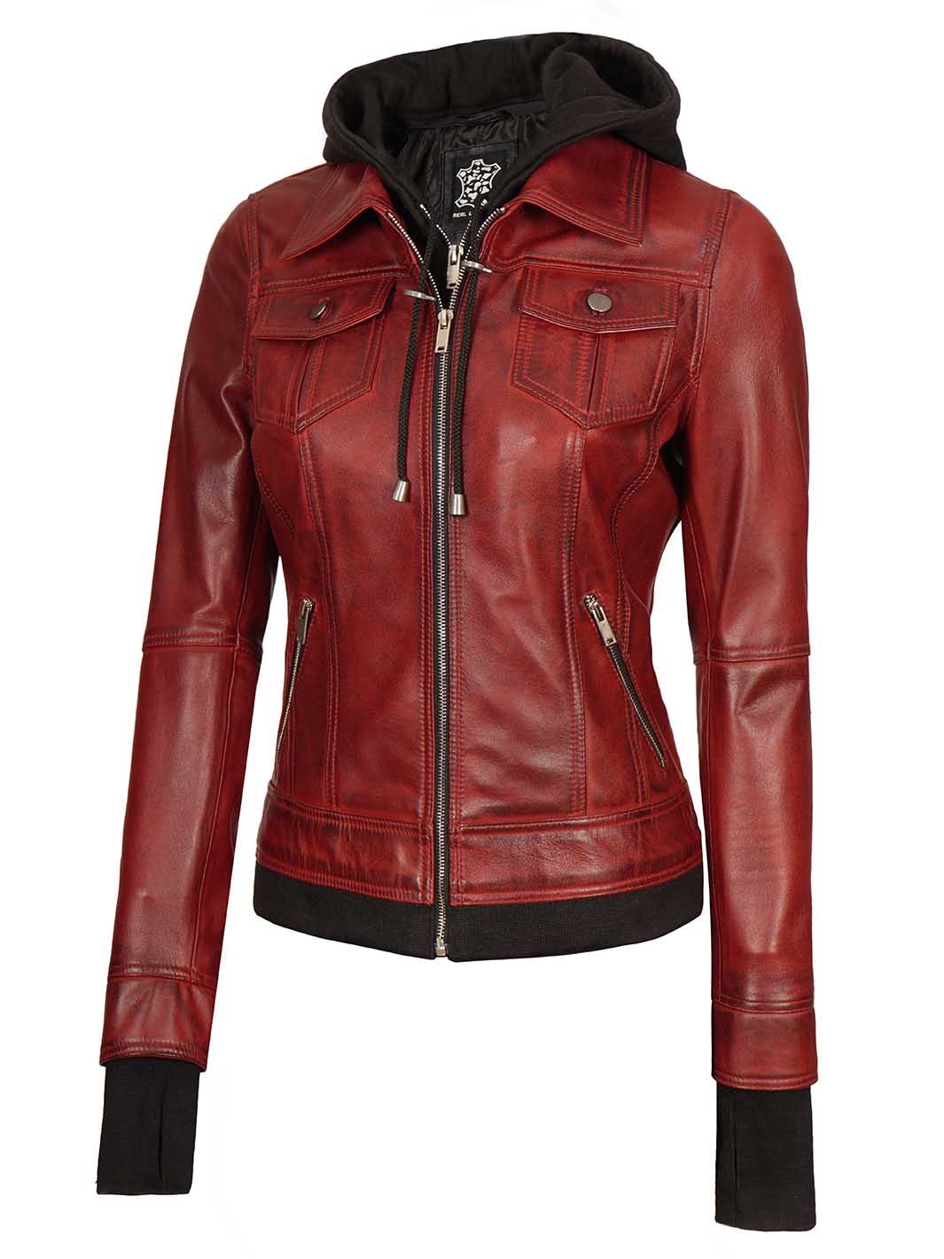 Make a bold statement with the Tralee women’s maroon bomber leather jacket, crafted from 100% real lambskin leather in a stunning burgundy color. The removable hood and bomber styling give you versatile looks for any occasion.