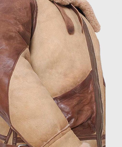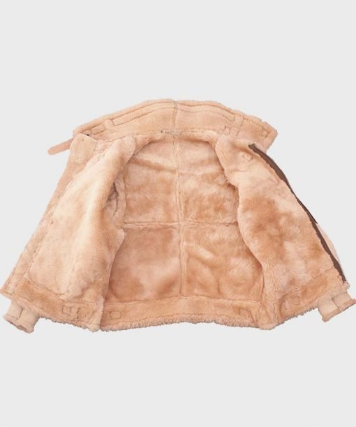 Tan Flying B3 Mens Shearling Light Brown Jacket has full-length sleeves and open hem shearling cuffs which looks mind-blowing. It has a high-quality metal front YKK zipper closure to protects you from a cold breeze. Also it gives you a handsome looking. Additionally, the sheepskin leather, shearling collar leather jacket has one side waist pocket, and two inner pockets provide you with keeping stuff. It comes in a light brown color, and all sizes are available at a reasonable price.