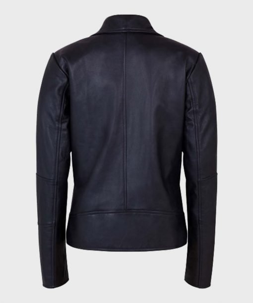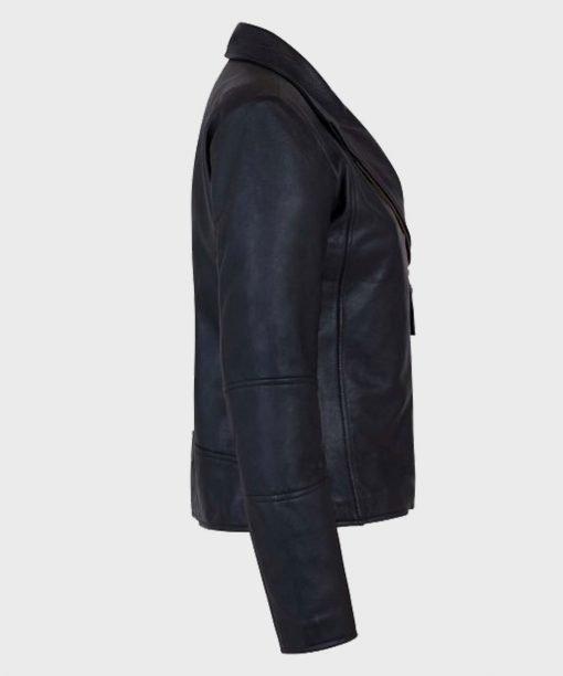 Women’s asymmetrical shawl collar black leather jacket has a front branded YKk zipper closure which gives off a beautiful look. Moreover, it has a lovely shawl collar that provides you a so unique look. The alluring shawl collar black leather jacket accommodates full-length sleeves and open hem cuffs. Furthermore, it has full-length sleeves and open hem cuffs which gives off a decent look. The lovely leather jacket is available in black color.