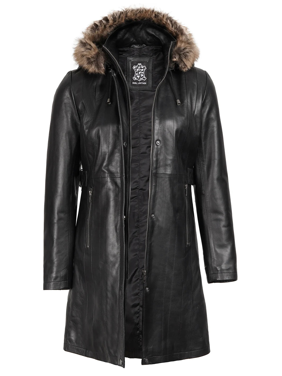 Stay warm in style with this Black Leather Shearling Coat for Women, designed in real leather with a full-length silhouette. It features a zip closure with a flap snap-tab overlay and a removable faux-shearling hood for added versatility. Practical pockets and soft inner lining make it an ideal winter companion.