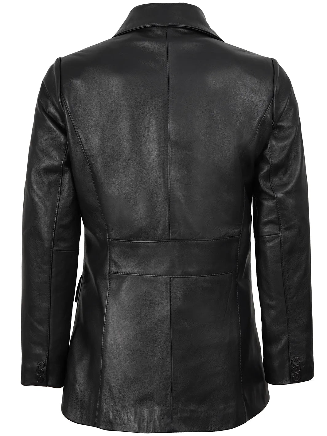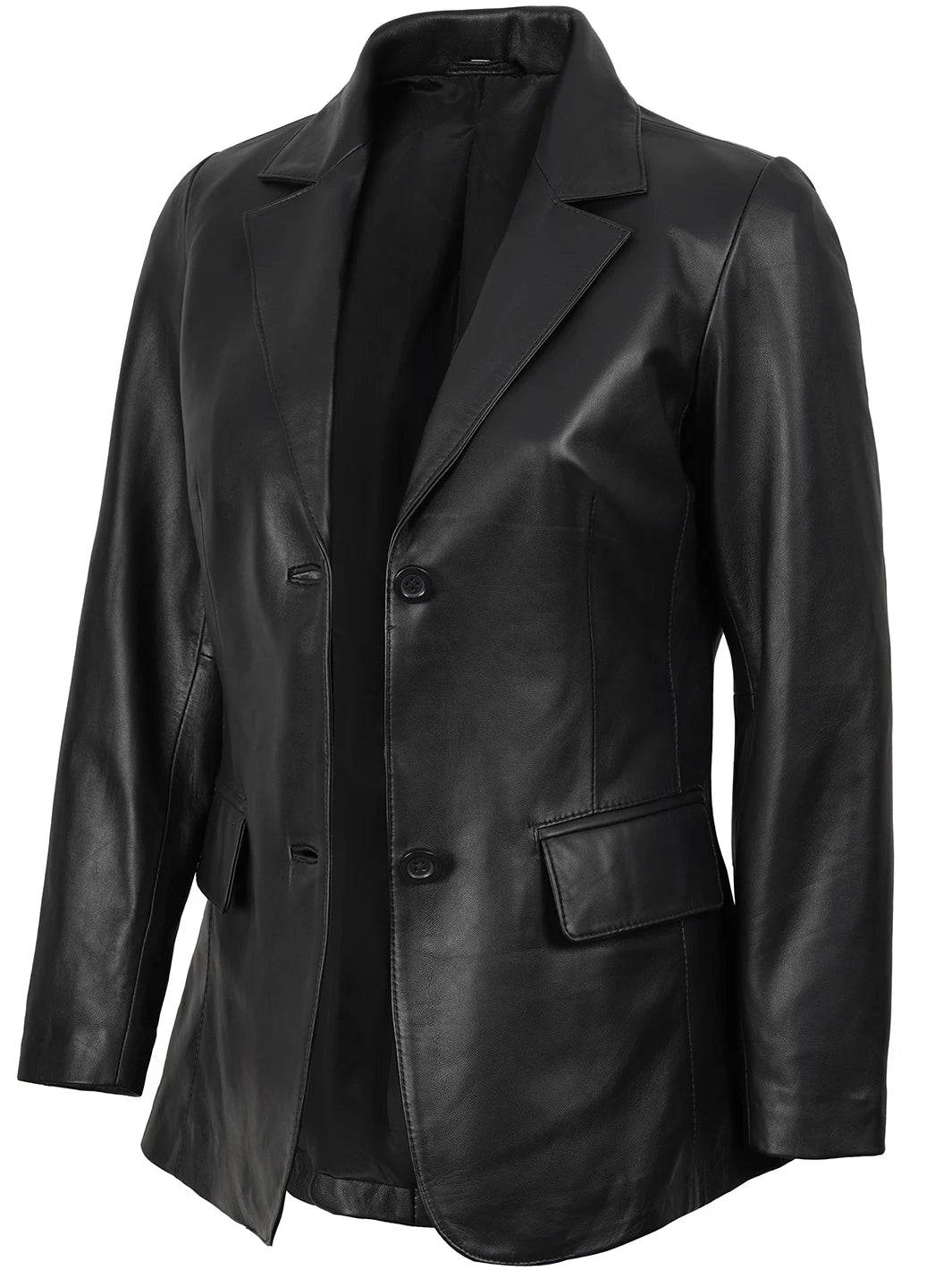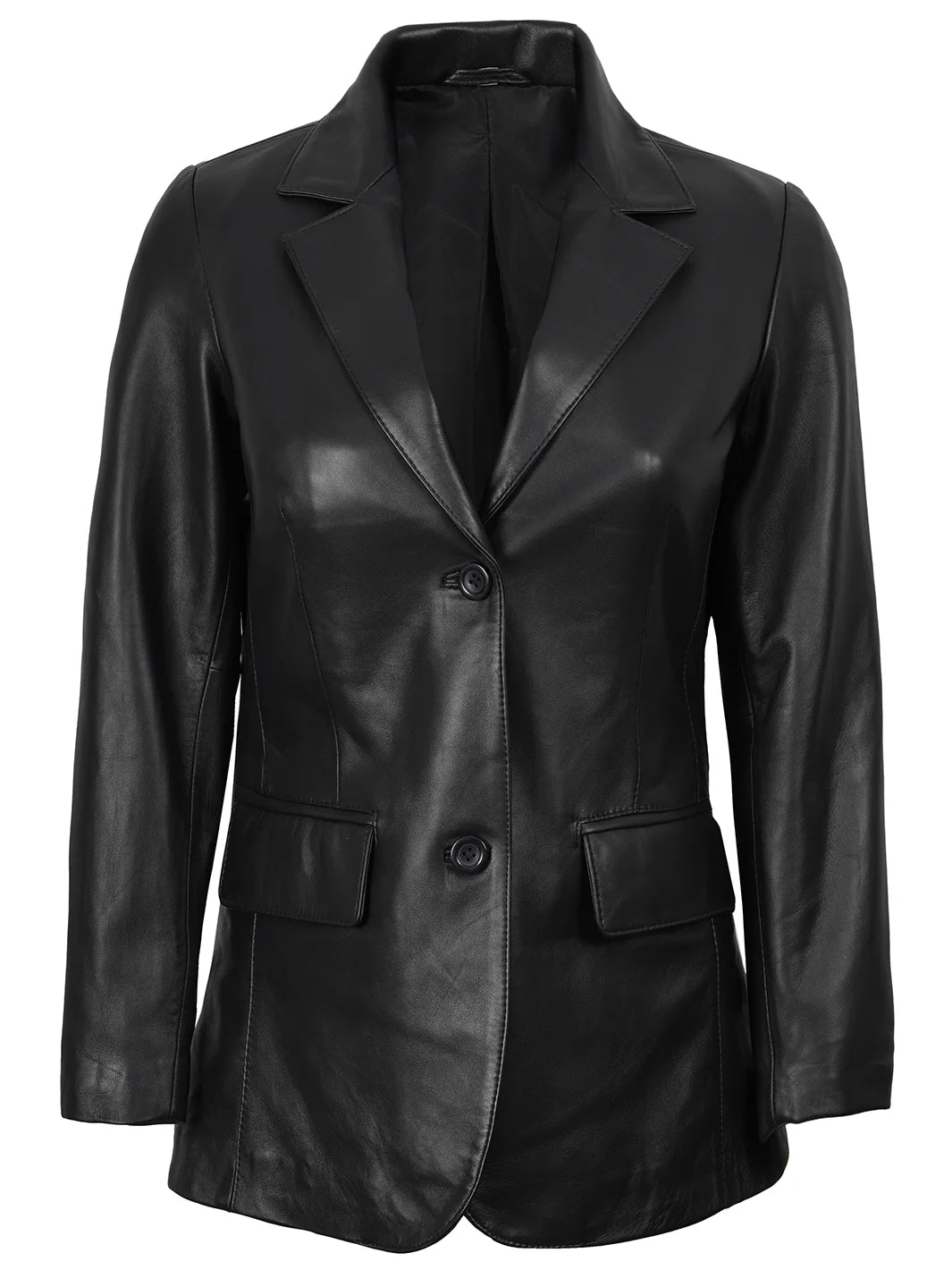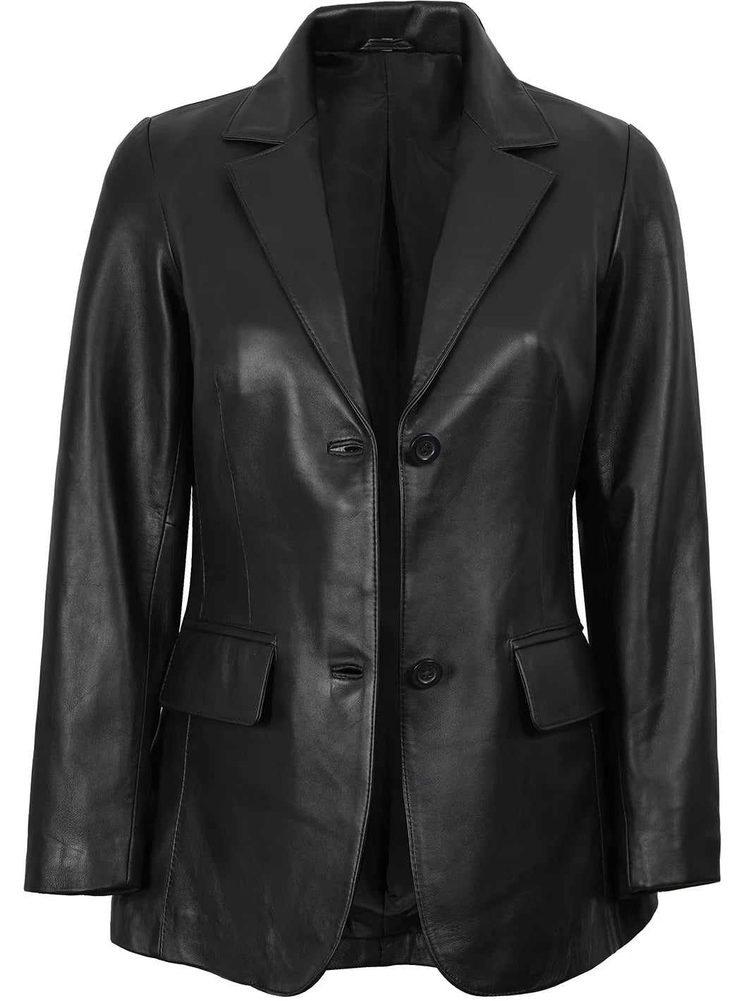Crafted for the modern woman, our leather blazer exudes sophistication and style. Made from real lambskin leather, it features a sleek two-button design that adds a touch of elegance to any outfit, with its versatile black color.