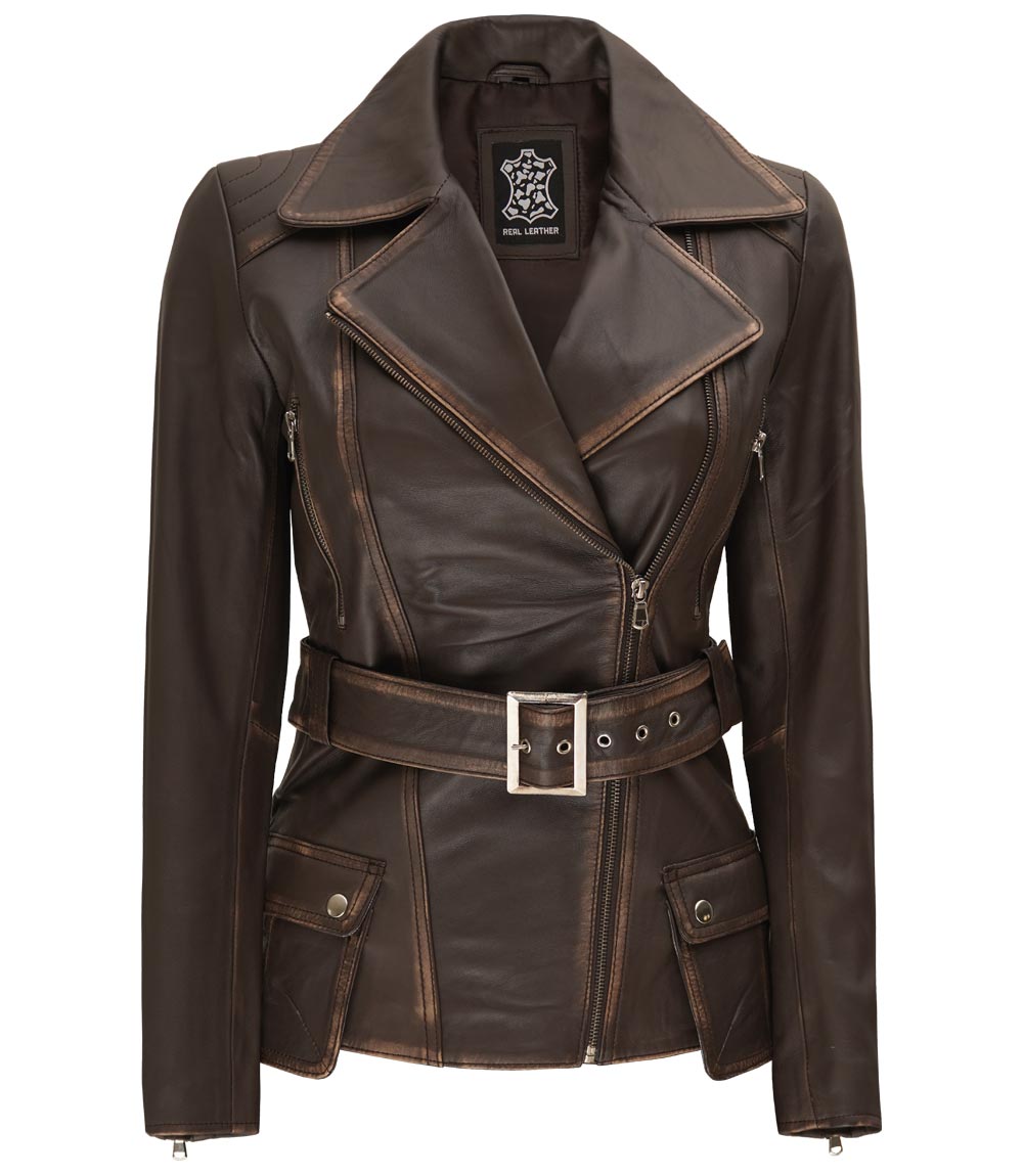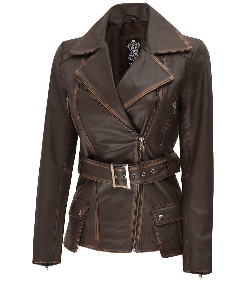 Womens Brown Asymmetrical Distressed Long Leather Jacket
