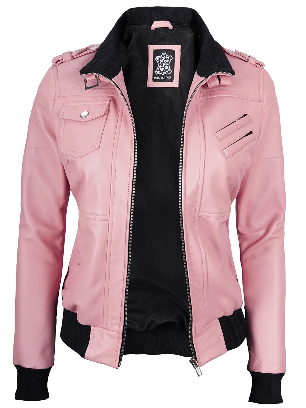 Made from 100% real lambskin leather, this eye-catching jacket features a detachable hood, YKK zip closure, and rib-knit cuffs for comfort. Styled with a belted buckle collar and three exterior pockets plus one internal pocket. Finished in vibrant pink for bold, fashion-forward appeal. Professional leather cleaning recommended.